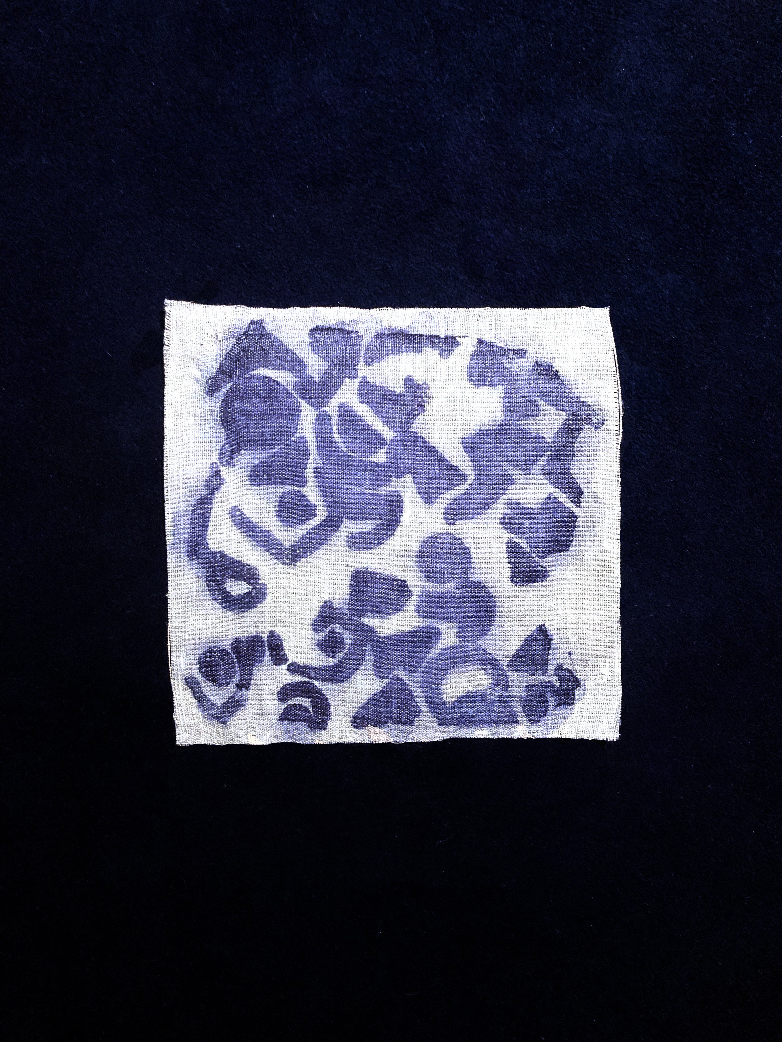 I decided to formulate a way of translating the bacteria’s communications – as a metaphor for the difficulties I have faced from time to time in the process of working with and understanding the bacteria – creating a kind of alphabet. I started with a bacteria dyed piece of fabric that I scanned and pixelated, matching different letters and letter combinations to the different colour shades. Patterns emerged, and while I chose the letters, as I continued reading this ‘language’ pixel by pixel, it became a very unexpected, beautiful, reactive exchange.